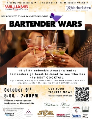 Thank you to our presenting sponsor Williams Lumber & Home Center, The Rhinebeck Chamber and Williams Lumber are proud to present The 8th Annual Bartender Wars!Signature: $795 - Includes signage, mentions in all event promotions, 4 event tickets, large logo feature on registration page and voting card, plus newsletter and social media exposure!