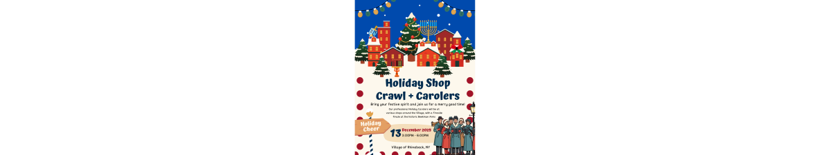 Celebrate the season in Rhinebeck with a festive afternoon of community cheer! Drop off toys and canned goods for our annual holiday drive, explore the debut of the Village Window Display Competition, and enjoy performances from our professional roaming Holiday Carolers. The festivities conclude with a cozy fireside sing-along at the historic Beekman Arms. Perfect for families, shoppers, and anyone looking to savor a little hometown holiday magic.